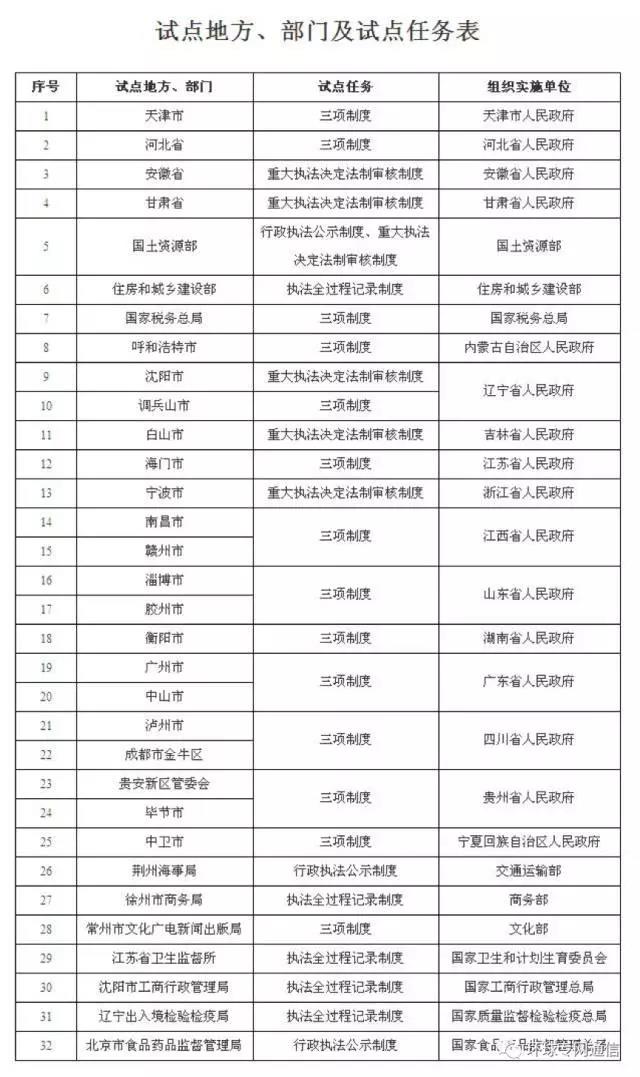 日前经党中央、国务院同意,国务院办公厅向各省、自治区、直辖市人民政府,国务院各部委、各直属机构印发《推行行政执法公示制度执法全过程记录制度重大执法决定法制审核制度试点工作方案》(编者注:《方案》成文于2017年1月19日,2月10日发布)。《方案》确定在天津市、河北省、安徽省、甘肃省、国土资源部以及呼和浩特市等32个地方和部门开展试点。各试点地方和部门在行政许可、行政处罚、行政强制、行政征收、行政收费、行政检查六类行政执法行为中推行行政执法公示制度、执法全过程记录制度和重大执法决定法制审核制度。