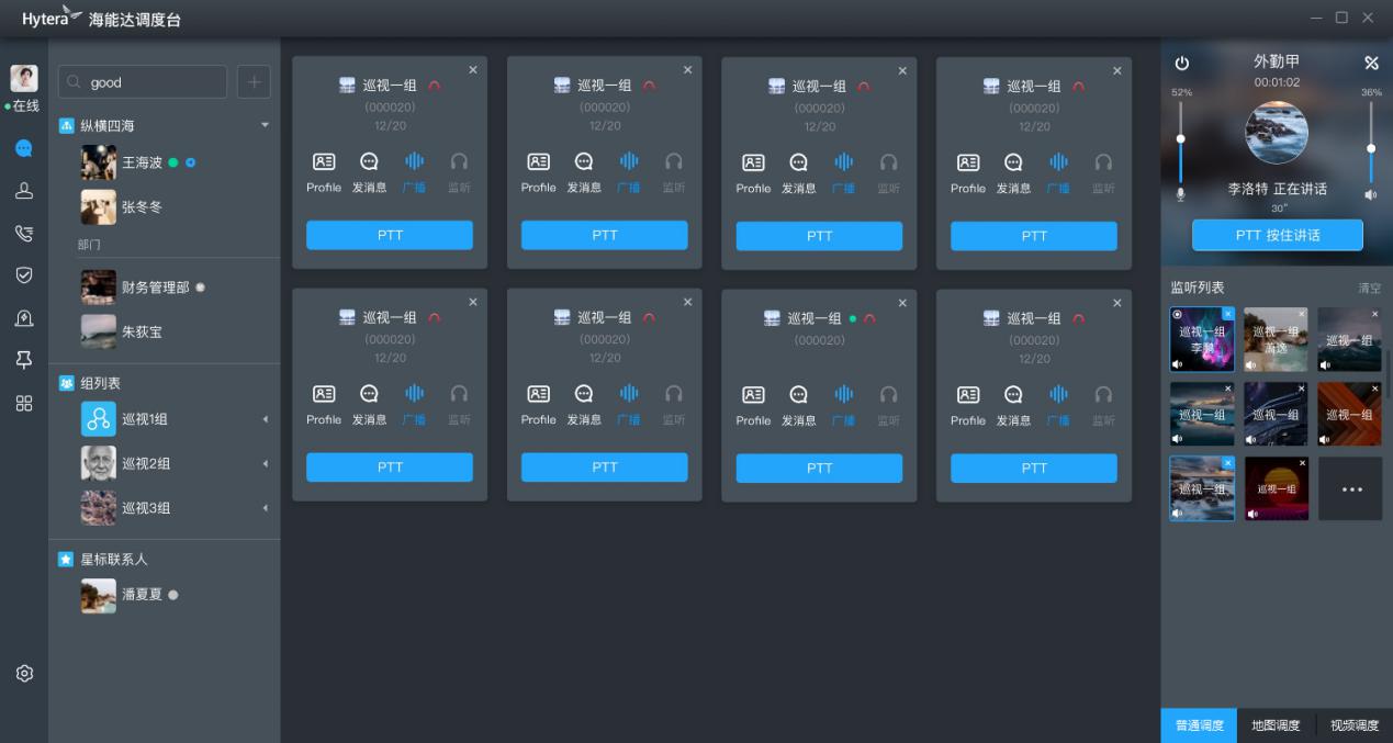 * HyTalk调度台是由是供调度人员完成日常业务调度管理的平台,主要实现普通语音调度、地图调度、视频调度等业务形式;调度台客户端包括完整的IM、语音视频、PTT通话能力,并包括主要的终端管理及其他管理能力。